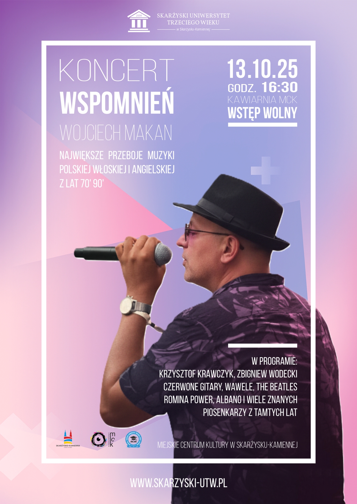 Koncert na żywo wykona Wojciech Makan, który przeniesie publiczność w świat największych hitów minionych dekad.