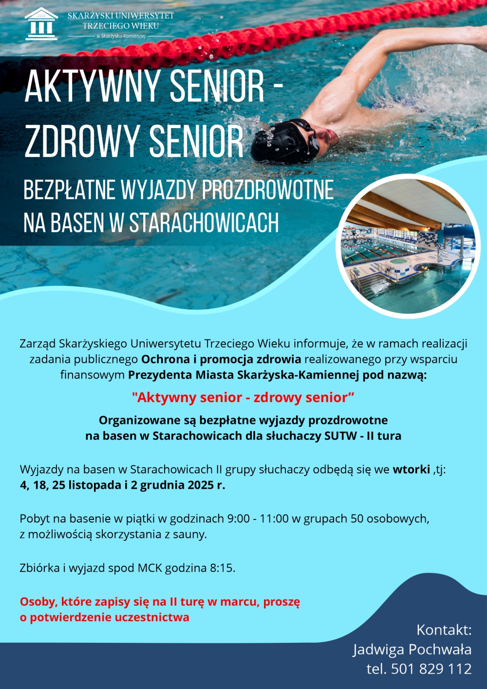 Zarząd Skarżyskiego Uniwersytetu Trzeciego Wieku informuje, że w ramach realizacji zadania publicznego Ochrona i promocja zdrowia realizowanego przy wsparciu finansowym Prezydenta Miasta Skarżyska-Kamiennej pod nazwą: "Aktywny senior - zdrowy senior” organizowane są bezpłatne wyjazdy prozdrowotne na basen w Starachowicach dla słuchaczy SUTW - II tura.